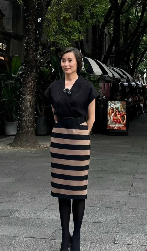 她身着一件黑色短袖上衣,搭配一条黑白相间的条纹裙子。