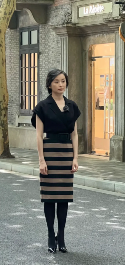 在户外的人行道上,她自然站立,面带微笑,仿佛与周围的行人和商店融为一体,展现出她的亲和力与接地气。
