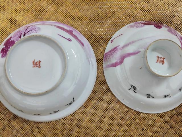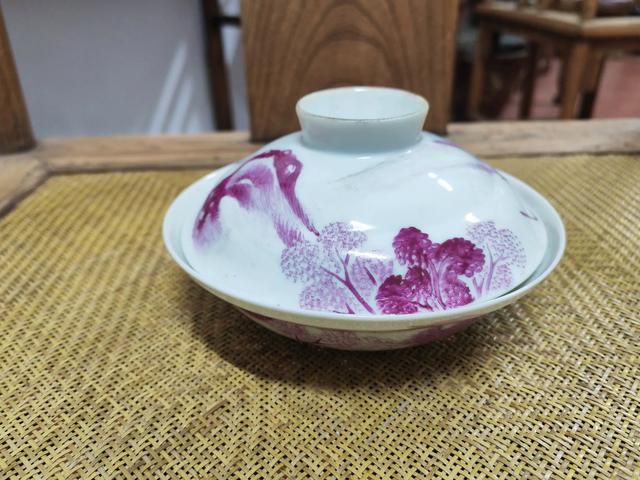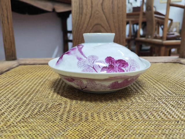 因为用胎细白,所以胭脂红彩山水,在合器上特别亮眼。