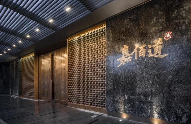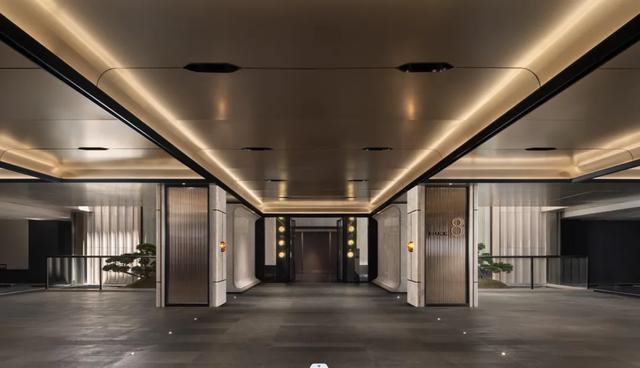 电梯厅外侧石材与金属拼接的墙面有着丰富的弧形纹理,电梯门和背景板上还有如流水般的暗纹,即使奢华酒店也难看到如此艺术品位的电梯。