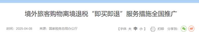 国家税务总局——境外旅客购物离境退税“即买即退”服务措施全国推广