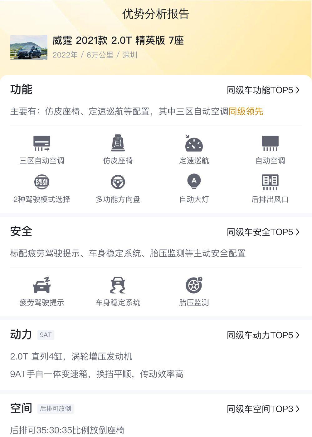 我们再来看看市面上同款车型的价格。根据一些二手车平台的数据,2021款威霆 2.0T 精英版 7座的行情价大致在21.77万到25.72万之间。这辆车的报价24.8万,基本处于市场中等偏上的水平。价格是否合理,最终还要取决于车辆的具体车况。