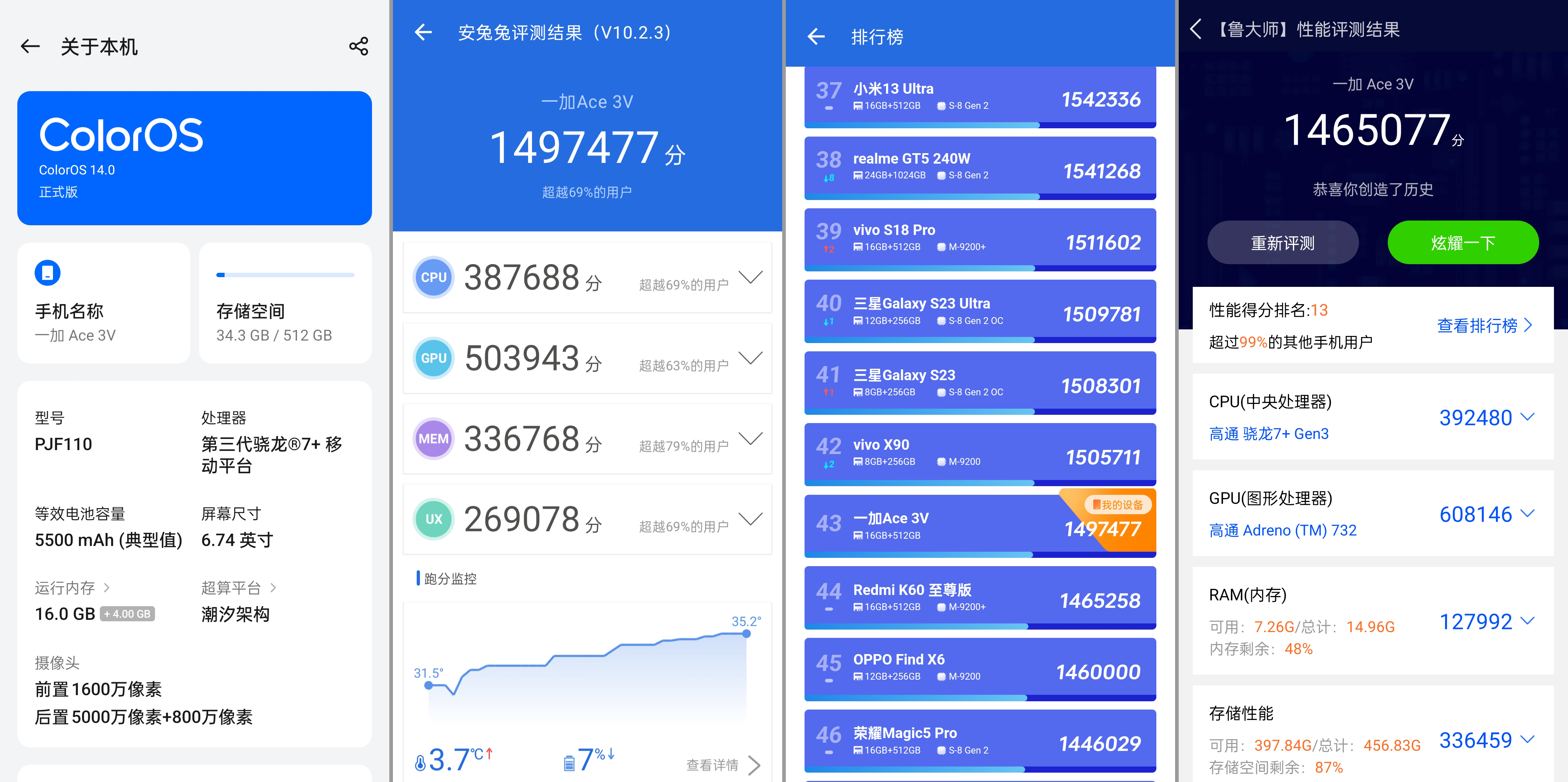 随意在安兔兔中跑了一遍,一加Ace 3V轻松拿到了1497477的成绩(CPU:387688,GPU:503943,MEN:336768,UX:269078)。在鲁大师中,分数也达到了1465077分。从排行榜来看,一加Ace 3V的表现会优于某些骁龙8 Gen2机型,全面超越骁龙8+ Gen1。而在测试时最高检测温度达35.2℃,散热效果相当优秀。
