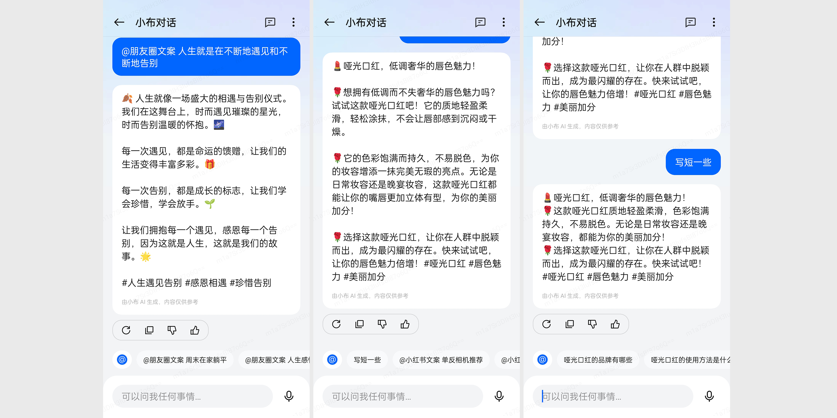 当遇到节日或者想发个超有意境的朋友圈时,我们可以直接借用“节日祝福”、“朋友圈文案”和“小红书文案”等功能,直接生成文字内容。让祝福传递的同时,自身也能显得很有文化底蕴。
