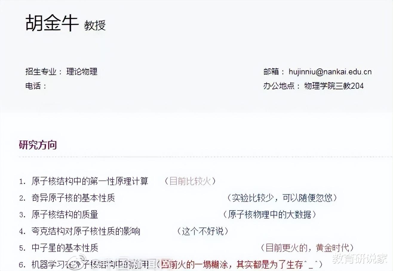 一方面,胡教授是研究物理方向的学术大佬,他的走红本该和他的学术研究有关,但现实并非如此。另一方面,只是因为胡教授敢于在简介上对自己进行“自嘲”,所以才引起大众的注意。