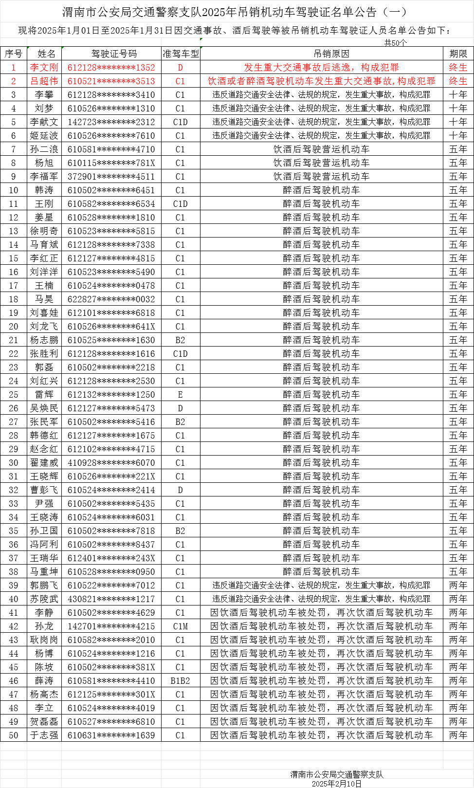 2025年1月1日- 2025年1月31日,渭南全市因道路交通事故、酒后驾驶等被吊销机动车驾驶证人员共计50人,其中,2人终身禁驾。#渭南头条#