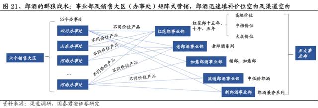 汪俊林制定了“一树三花、群狼战术”的策略,“一树三花”即在酱香、浓香、兼香三个香型上全线发力;“群狼战术”即在同区域、多品牌、多战线各自为战,业绩为王。