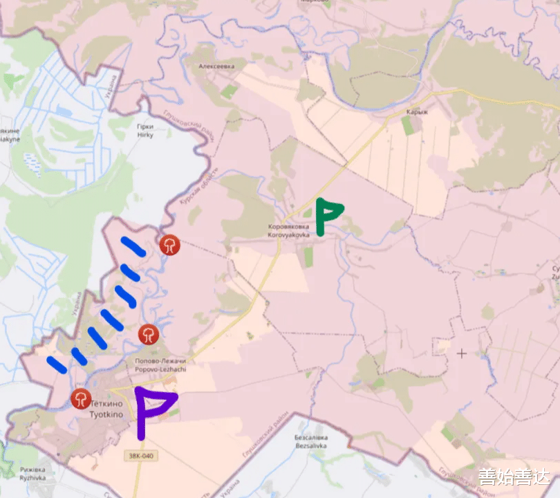 从迹象看,库尔斯克突破口西侧的格鲁什科夫斯基地区(下图左侧紫色旗和棕色旗位置),大规模战斗正在酝酿中(左侧蓝色虚线和实线箭头)。