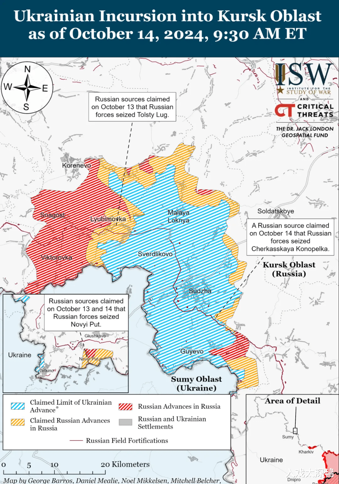 10 月 14 日,俄罗斯军队重新夺回了格卢什科夫斯基区(位于库尔斯克州乌克兰主要突出部以西)的领土。俄军占领了新普特(格卢什科沃西南部),并将乌克兰军队赶出了韦谢洛耶以南(也位于格卢什科沃西南部)大部分乌克兰突出部。俄罗斯消息人士称:乌克兰军队在新普特附近发动了反击。俄军第 56 空降兵团(第 106 空降兵师)的部分部队正在格卢什科夫斯基区作战,目前交火情况和伤亡数字尚无消息。分析俄军在近期加强了兵力投入,扩大了攻势,一个原因是库尔斯克州雨季已经到来,雨季造成了道路泥泞,不便于装甲和地面部队的展开和机动。俄军的机械化部队大多为履带式,相对而言乌军则更多依靠轮式车辆作战和运输,俄军在机械化部队上保持了一定优势。目前泥泞的道路同时影响了乌克兰和俄罗斯的作战行动。俄军大概率会在美国大选和冬季到来之前,进行更猛烈的攻势,以达到将乌军压制到库尔斯克州边境以外的作战目的。车臣阿赫马特特种部队司令阿普蒂·阿劳迪诺夫 10 月 14 日声称:俄罗斯军队已经夺回了乌克兰军队在库尔斯克州占领的大约一半领土。第三方信源ISW通过地图标记表明俄罗斯军队夺回了库尔斯克州乌克兰突出部内约 46% 的领土,这同夺回库尔斯克州的一半的说法有比较大的出入。乌东战场分析:10 月 14 日,俄军在继续沿库皮扬斯克-斯瓦托韦-克里米纳一线的进攻行动中,小幅推进至克里米纳西北部。有消息称俄罗斯第 144 摩托化步枪师(第 20 合成军 [CAA]、莫斯科军区 [MMD])的部分部队已推进至诺沃萨多夫(克里米纳西北部)以东,这一消息尚未经乌方和第三方信源确认。乌克兰北顿涅茨克市行政长官罗曼·弗拉先科表示:俄军重点攻击克里米纳西北部,朝 Zhuravka Balka 和 Makiivka 方向进攻。乌克兰消息人士报道称,俄军于 10 月 13 日和 14 日在 Starytsya(沃夫昌斯克西南)附近发动地面袭击。俄罗斯第 16 特种旅(俄罗斯总参谋部总局 [GRU])的部分部队继续在哈尔科夫州北部活动,第 18 摩托化步兵师(第 11 军 [AC]、列宁格勒军区 [LMD])的部分部队据称继续在 Lyptsi(哈尔科夫市北部)附近作战。“不挑动情绪,不预设立场”