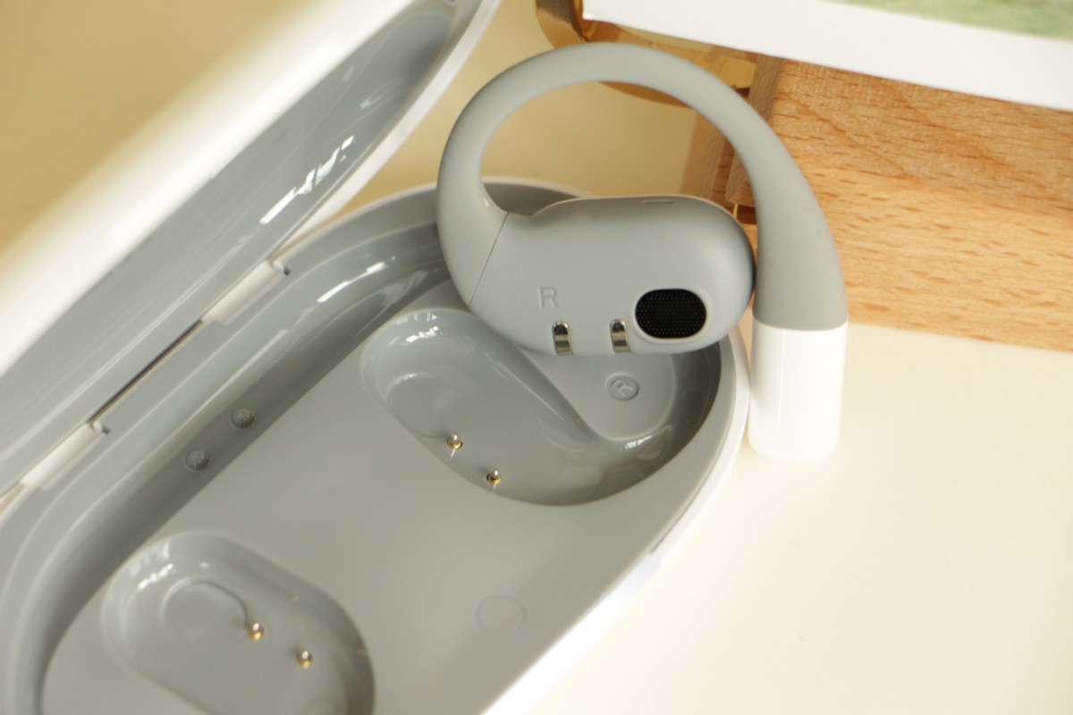 外观形状就像耳朵一样的耳机,稳稳地放置在仓内。