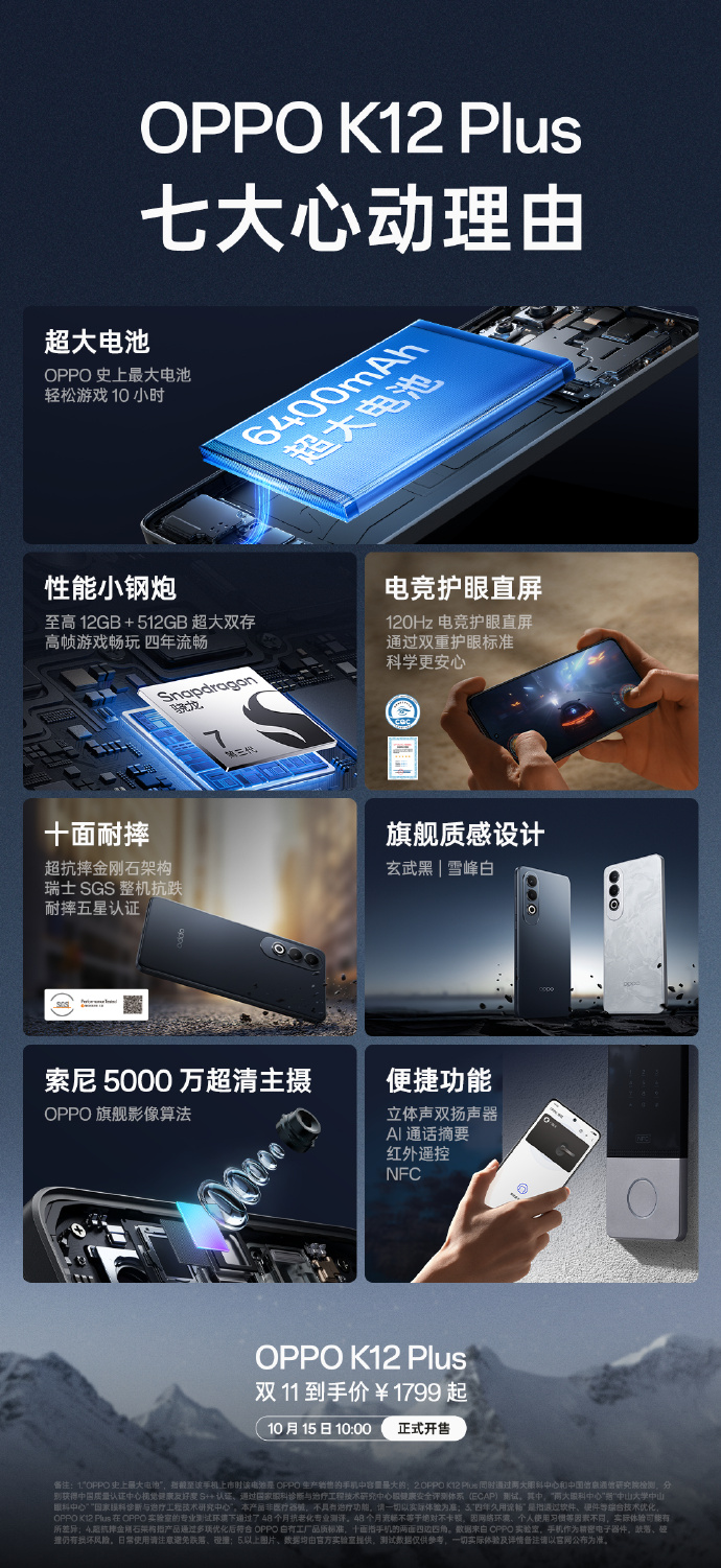 除了有着拉满的防御力外,OPPO K12 Plus还有着6400mAh的超大电池,基本可以满足超高强度的户外工作一整天,如果强度稍微弱一些,两天一充完全没有问题。而且在售价方面,OPPO K12 Plus双11最低到手价只要1799元起,也非常的实惠,感兴趣的各位不妨可以去线下看一看。