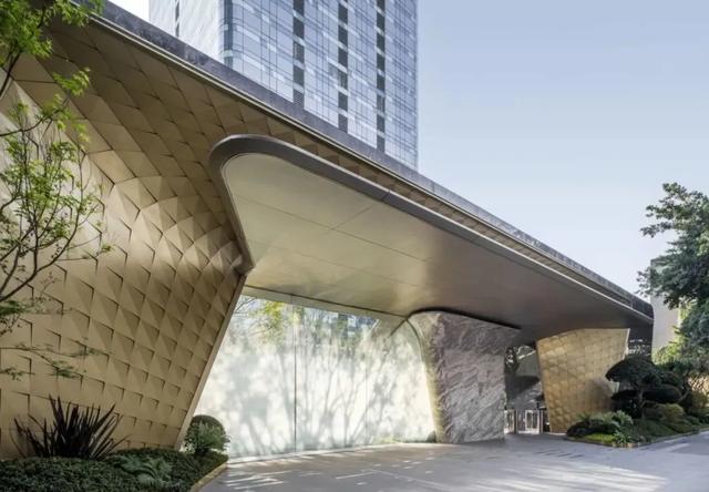与当下很多豪宅千篇一律的采用中式或新古典府门不同,成都嘉佰道入口的灵感源自迪拜世博会场馆——
