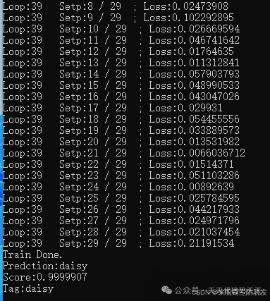 static void Test(){ string testPath = path; DataClass dataClass = new DataClass(testPath); var data = dataClass.GetTensor(0); var img = data["img"].unsqueeze(0).to(scalarType, device); var resnet = torchvision.models.resnet18(5,device: device).to(scalarType); resnet.load(modelName); resnet.eval(); Tensor re = (Tensor)resnet.forward(img); re = torch.softmax(re, 1); var (max, index) = re.max(1); Console.WriteLine("Predction:{0}\r\nScore:{1}\r\nTag:{2}", dataClass.GetTagNameByTag((int)index.ToInt64()), max.ToSingle(), dataClass.GetTagName(0));}实现效果通过训练+推理,可以得到如下效果,其中训练40轮,最终推理的准确度已经非常高了。