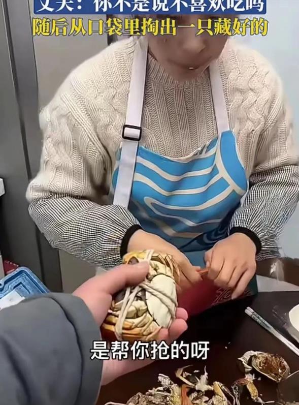 这只螃蟹并不是随便拿出来的,而是李大哥早在餐前就特意藏好的。他知道,李大姐会为孩子们让着,所以提前准备了一只完整的螃蟹,决定在她不注意的时候悄悄递给她。