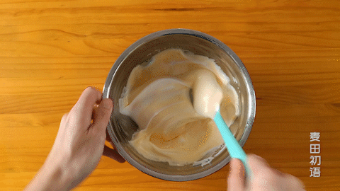 混合蛋白与蛋黄面糊需要采用翻拌手法,类似于“J”字型直上直下的方式翻拌,可以避免搅拌时消泡。混合好的面糊细腻有光泽,黏稠度很高。