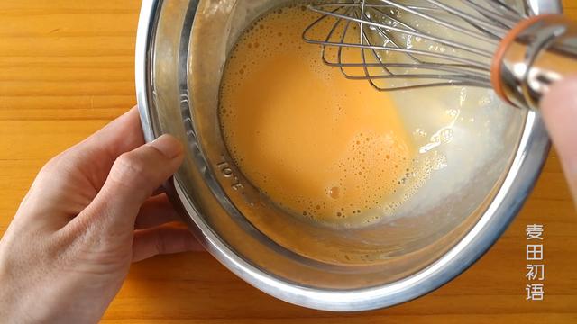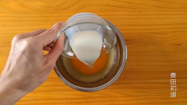 先制作蛋黄面糊。蛋黄中加入玉米油,用打蛋器搅拌均匀。然后加入牛奶,用打蛋器充分搅拌,使其乳化到位。