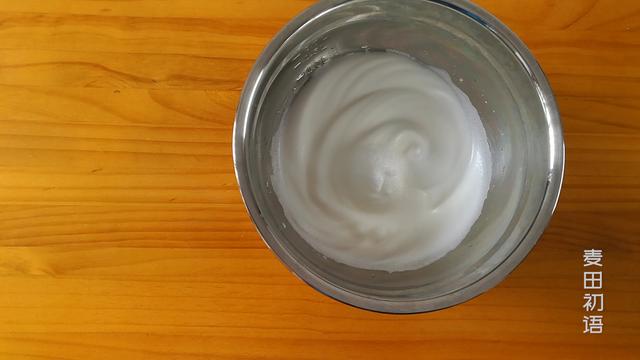 当提起停止的打蛋器能看到短小的直立尖角,倾斜打蛋盆蛋白不会移动,插入筷子不会倒,则说明蛋白打发至干性发泡,蛋白打发到位。在本教程中,打发蛋白我总共用了5分钟左右,打发时间仅供参考,要根据你的打蛋器转速灵活调整。