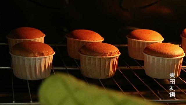 尽管这款纸杯戚风蛋糕的模具很小,但它依然需要烘烤较长的时间。因为戚风的膨胀程度高,而出炉后又不需要倒扣,所以冷却后非常容易塌陷,通过充分烤熟能避免这种情况发生。同时为了防止开裂,前期采用低温烘烤,后期再转高温让蛋糕上色。但不管怎么样,出炉后蛋糕总会有轻微的收缩,这是正常现象。