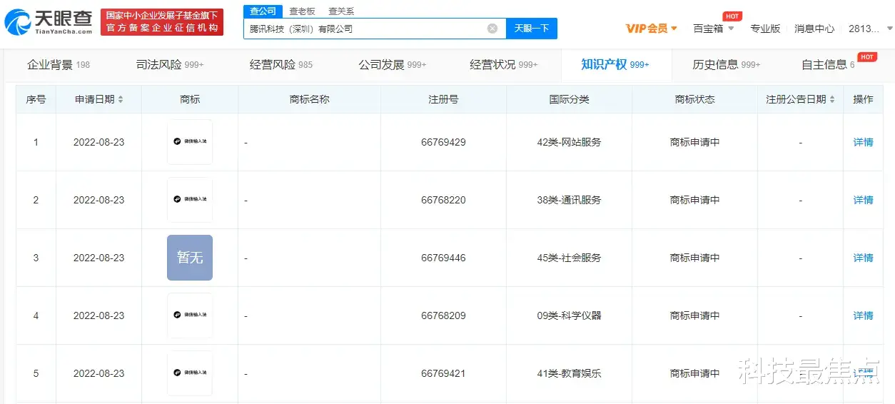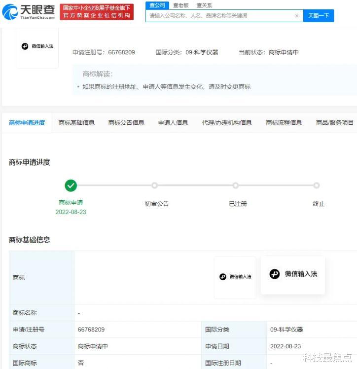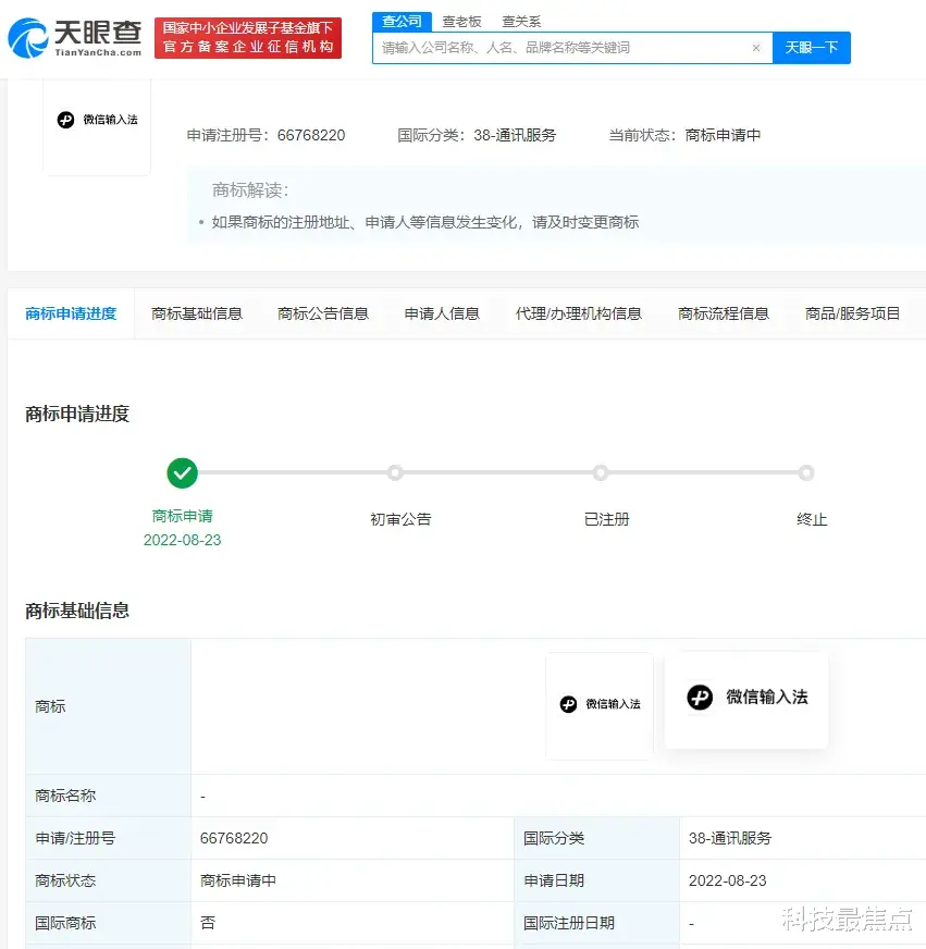 天眼查App显示,近日,腾讯科技(深圳)有限公司申请注册多个“微信输入法”图形商标,国际分类涉及科学仪器、教育娱乐、通讯服务等,当前商标状态均为申请中。
