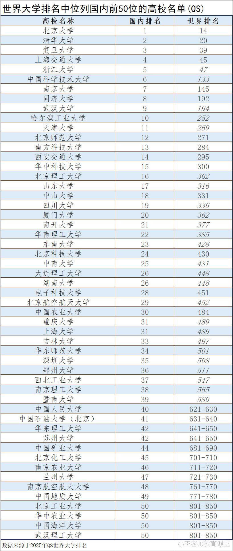 为了让大家对国内实力较强的高校群体有一个直观感受,笔者将2025年QS世界大学排名和2024-2025年度U.S. News & World Report世界大学排名(以下简称“QS排名”和“U.S. News排名”)中排国内前50位的高校名单整理了出来,分别制作了表单,供大家参考。