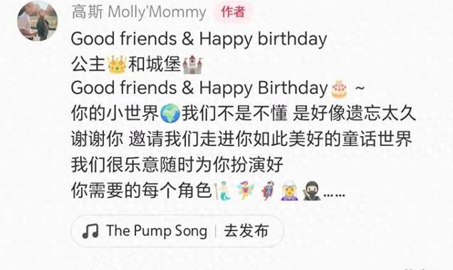 她写道:Good friends &Happy birthday。公主和城堡。Good friends &Happy birthday~你的小世界我们不是不懂,是好像遗忘太久,谢谢你邀请我们走进你如此美好的童话世界,我们很乐意随时为你扮演好你需要的每个角色。