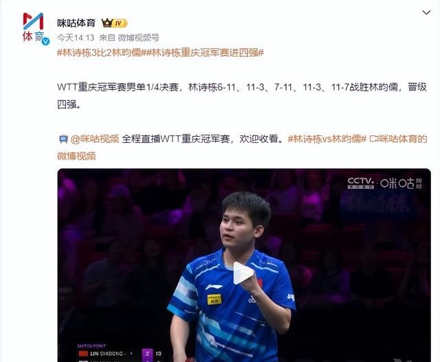 中午12:45分,WTT重庆冠军赛男单八强战,林诗栋对战林昀儒。