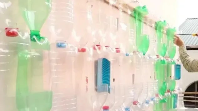 挂瓶子也有门道:墙上先钉个结实的木板,得能承重20斤。4个瓶子一组,倒着挂在木板上。大叔挂了15列,咱们可以根据自家墙面大小来定。挂的时候要留心,瓶子之间的距离要一样,这样开花了才好看。