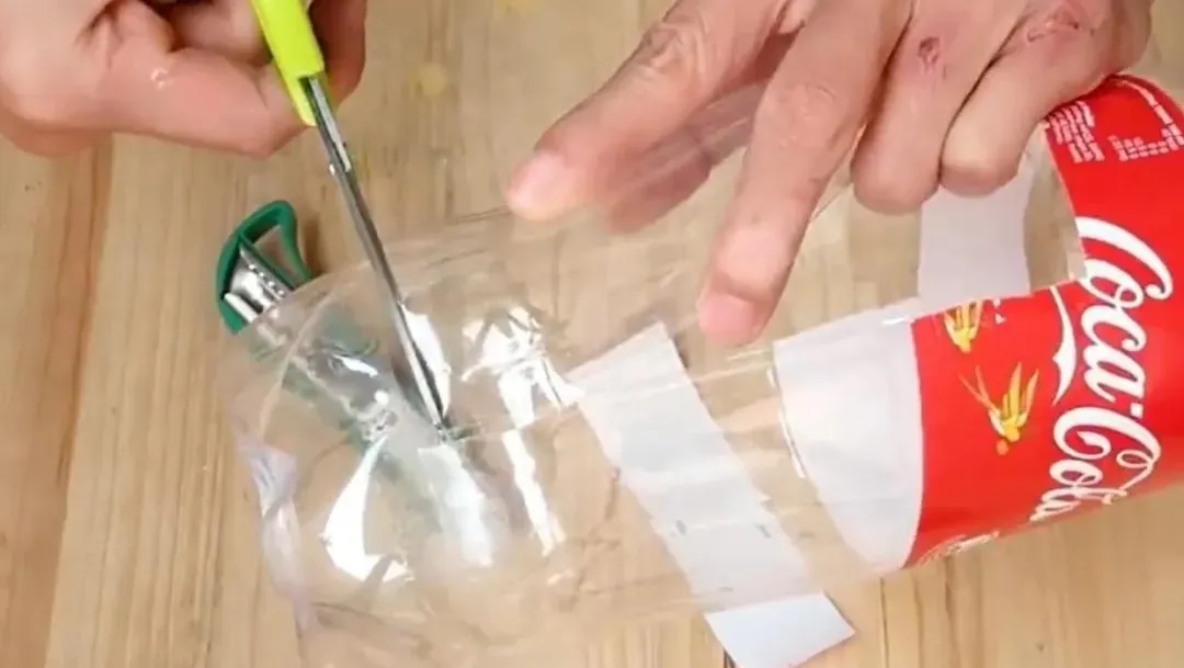 剪瓶子的时候有讲究:侧面开个长方形的口子,大小要合适,别把瓶底剪破了。瓶底还得打个跟瓶口差不多大的洞,这样瓶子能串一串,挂上去又结实又省事。要是担心瓶子掉下来,还可以用铁丝加固一下。