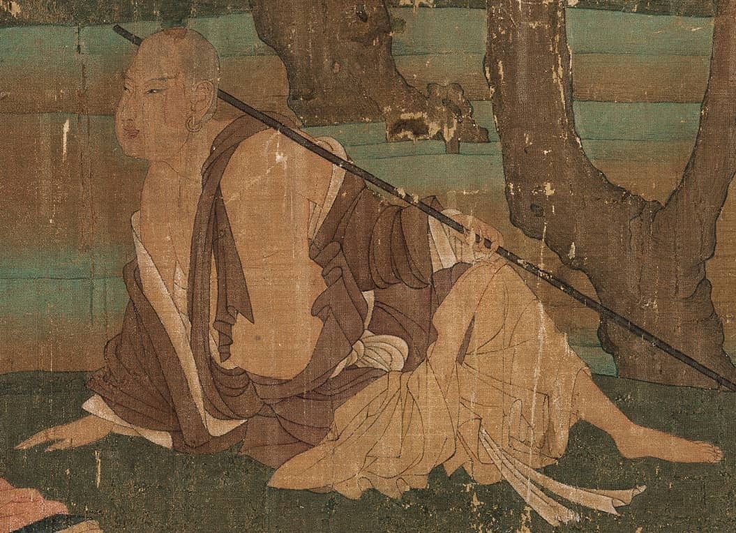 画面以精湛的技巧,生动地描绘了晋代名僧支遁爱马又爱鹰的故事。岸边石榻上坐的僧人就是支遁,他秃头、宽衣、祖胸、赤足,一手在侧前拄榻,一手在身后握杖,旁另一石榻上坐一士人,衣冠整齐,背对观者。两人相对斜坐,身体均倾向水面,在全神贯注地观看由水面奔腾而来的白色骏马。骑在马上的童子,头披长发,神采飞扬,一手持缰,一手执策,支遁身后站一仆人,深目高鼻,拱向侧前的双手上立一雄鹰。水面碧波浩渺,石岸曲曲弯弯,树干粗大。置身于这种恬静境地中的人们,完全陶醉在神骏的风采上了。作者通过对支遁养马又养鹰这种闲逸的生活形象,创造了一个超出人间凡俗之外的清静之地。