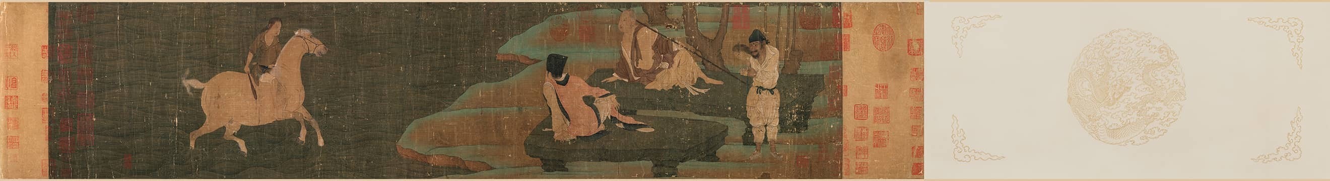 韩幹《神骏图》,本幅包首宋缂丝本,纵28.1、横21厘米;引首纸本,纵28.1、横70.5厘米;前隔水黄绫本,纵28.1、横12.6厘米;画心绢本,设色,纵27.5、横122.5厘米;后隔水黄绫本,纵28.1、横7.5厘米;拖尾纸本,纵28.1、横203厘米。现收藏于辽宁省博物馆。