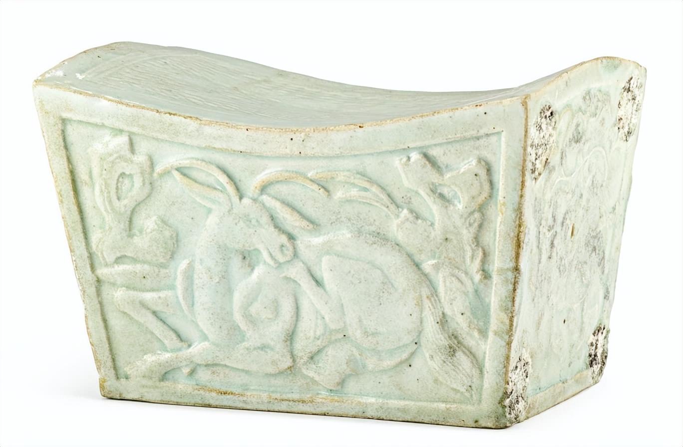 隋唐时期有瓷枕,及至宋代,烧瓷技术更发达,瓷枕款式花纹越趋精巧。瓷枕材质冰冷,可消夏纳凉,如北宋诗人张耒作《谢黄师是惠碧瓷枕》:“巩人作枕坚且青,故人赠我消炎蒸。持之入室凉风生,脑寒发冷泥丸惊。”材质硬又高的瓷枕看似不太符合现代人对舒适的要求,但观乎时人的描述,却又不是那么一回事。晚明高濂《遵生八笺》曾言:“有用磁石为枕……最能明目益睛,至老可读细书”。可见,古人对枕头的要求,不一定是求舒适,也着重养生练精魄的功效。