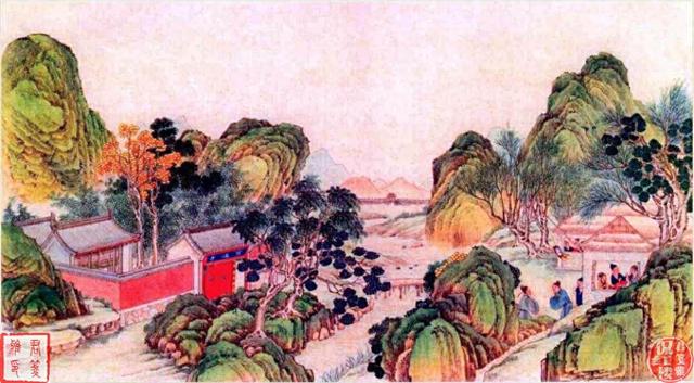 画家孙温笔下这段描写分了两个场景。一个是贾雨村遇见故人冷子兴,张如圭,令他振奋鼓舞的是听到朝廷有起复的机会。他的机缘就在林如海以及背后的荣国府贾家。不过画家却用非常大的篇幅描写了空无一人的“智通寺”,用动与静对比,凸显出智通寺“身后有余忘缩手,眼前无路想回头”这幅对联的精髓。