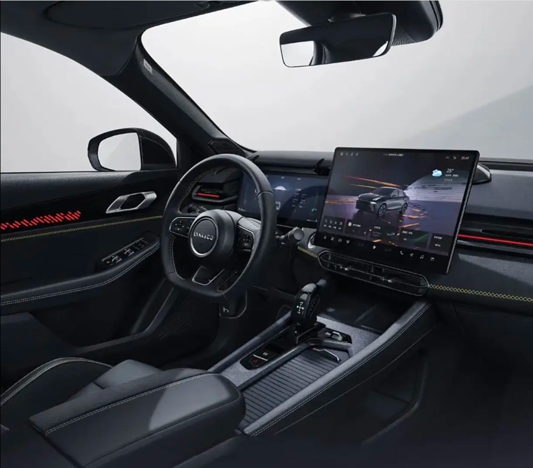 内饰部分,领克 03 冠军版配备了 15.4 英寸 2.5K 智能娱乐高清大屏,搭载高通骁龙 8155 芯片,支持 Flyme Link 系统,配备 50W 手机无线快充。内饰整体采用黑色配色 + 黄色缝线的搭配,并辅以红色氛围灯,运动氛围浓郁。