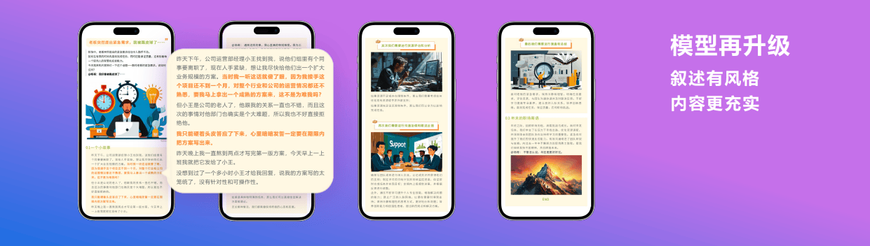 作为36Kr评选出的WISE2024年度用户体验与产品创新案例,讯飞绘文用技术迭代和产品创新不断给用户带来惊喜。全新的写作模型,让文章具备独特风格,确保内容丰富性。新增的“轻图文”功能,仅需输入主题便能生成具有视觉冲击力的组图,极大地丰富文字表达形式,让传播抢占先机。