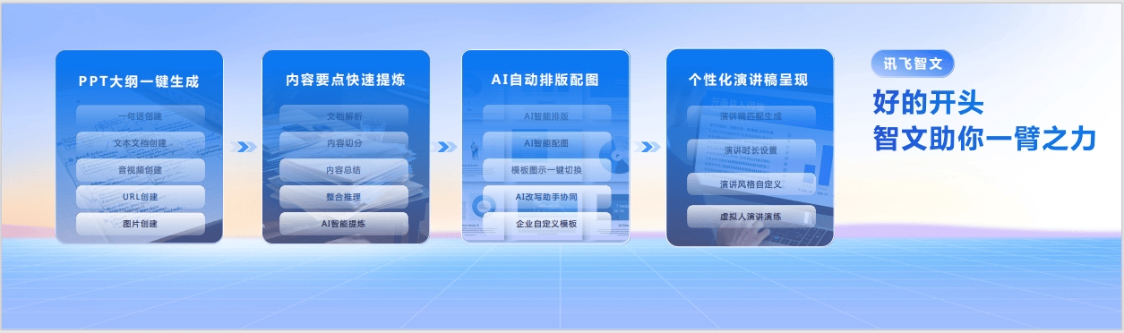 制作一份高质量PPT,从资料搜集、整理到演讲汇报,平均耗时5.5天。全新发布的讯飞智文,从大纲构建、内容提炼、排版设计、配图生成到个性化演讲稿撰写“一键完成”,分钟级就能完成初稿。