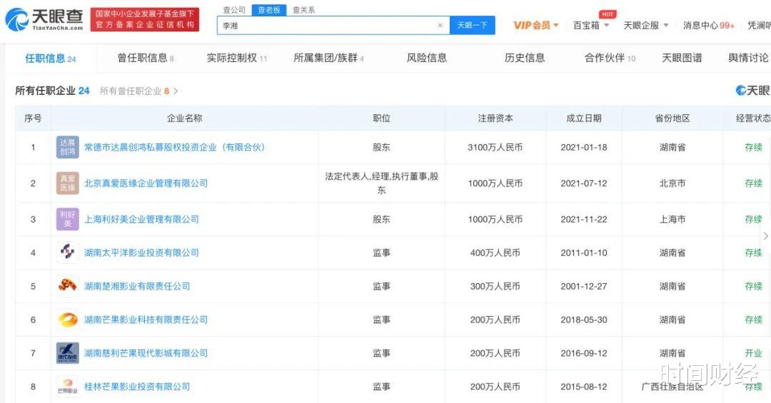 天眼查App显示,李湘名下关联公司有24家,其中14家为存续状态,包括湖南楚湘影业有限责任公司、常德市达晨创鸿私募股权投资企业(有限合伙)、上海利好美企业管理有限公司等,投资版图涉及投资、企业管理、传媒等。