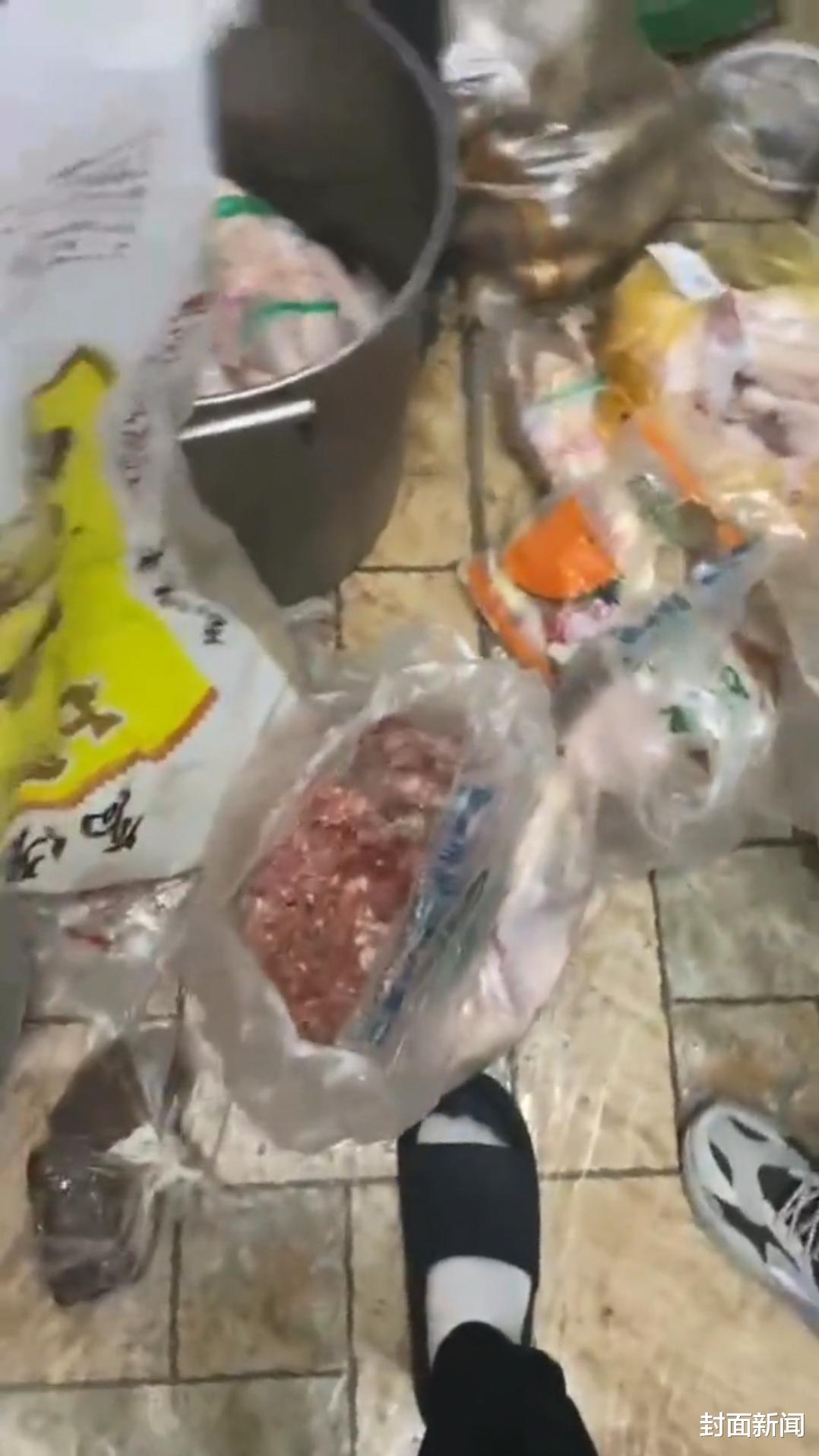 家长们向封面新闻记者提供的部分视频显示,一些食材被堆放在办公室和宿舍地上,家长不断在箱子里翻找,展示包装上的生产日期和保质期,并指出其中一包肉末发臭。