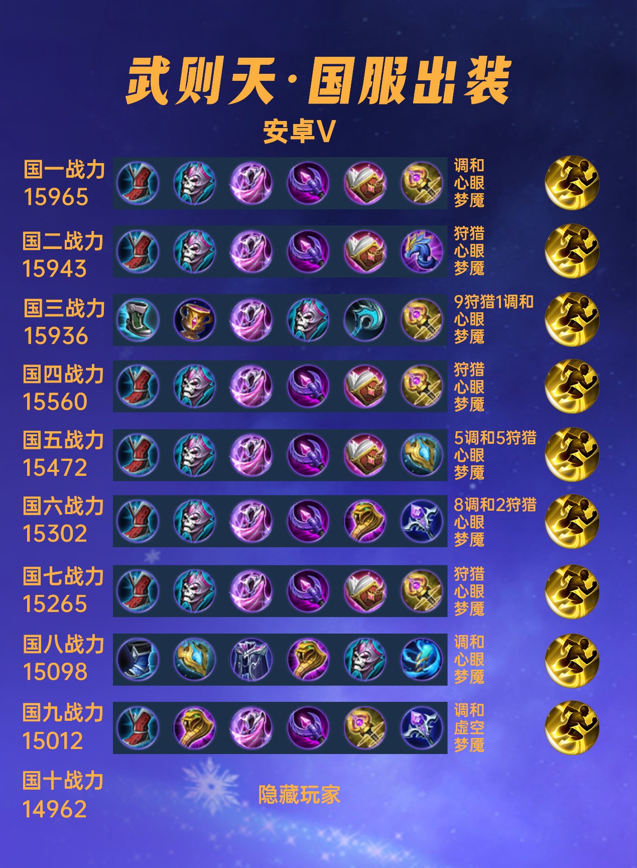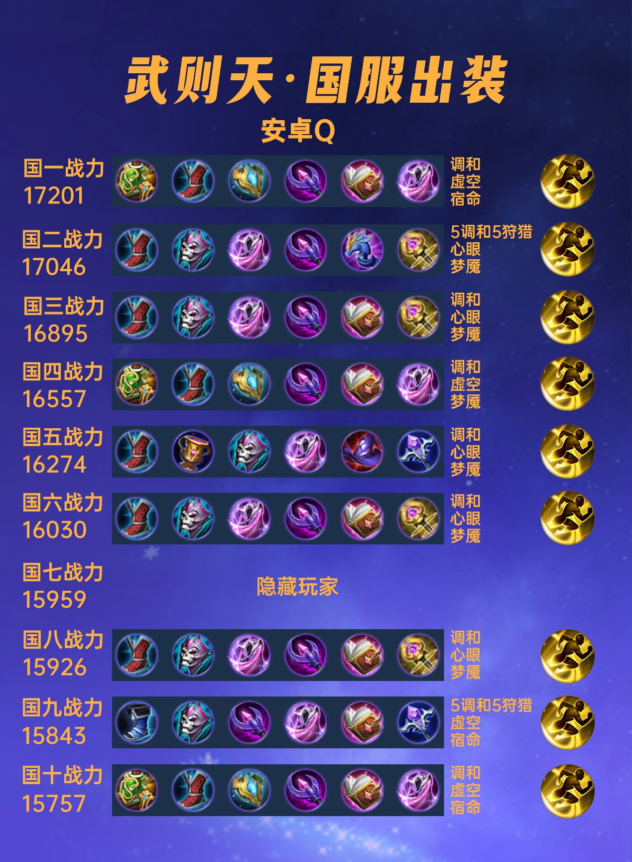 先做一个小统计,40位国服选手中,隐藏玩家有4位,打辅助的有5个,其余的31位都是中路。这个比例说明辅助武则天还是有点东西的,不然不会有5个国服都在玩,而且有两个是国一,战力还非常高。后续会对辅助武则天进行专门的测评~