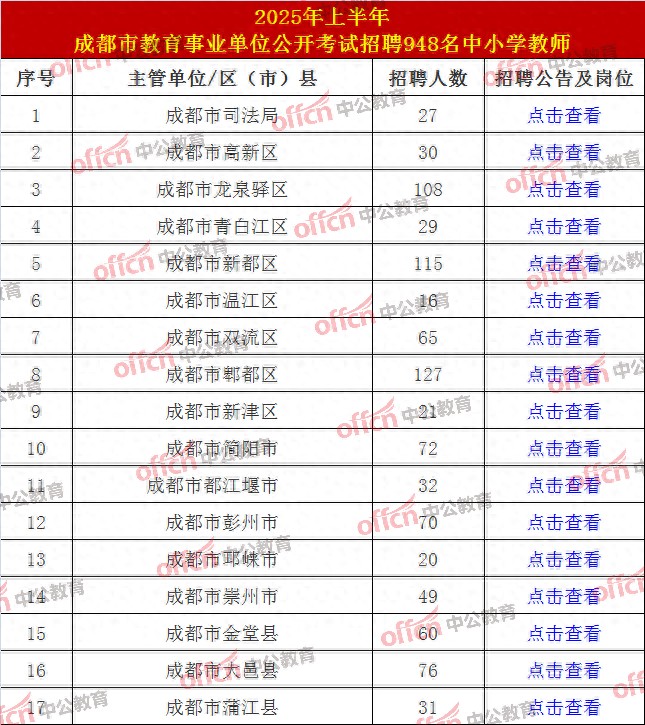 据成都人社局3月19日消息,成都市教育事业单位2025年上半年公开考试招聘中小学教师公告已发布,成都市高新区、龙泉驿区、新都区、温江区、双流区、彭州市、简阳市、大邑县等16个区(市)县,共招聘教师948人,为编制内正式工作人员。