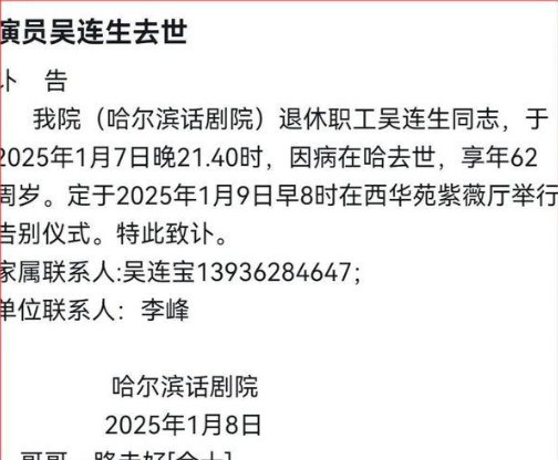 戈滨老师表示,吴老师是哈尔滨话剧院的退休职工,在62岁因病去世,这篇讣告中我们可以知道,吴连生老师才退休没几年,就因病离世,