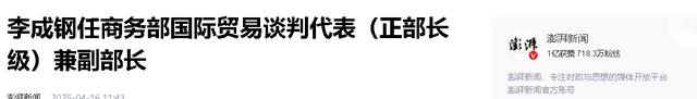 澎湃新闻:2025-04-16《李成钢任商务部国际贸易谈判代表(正部长级)兼副部长》