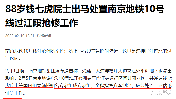 钱七虎院士在88岁高龄被邀请参加南京地铁过江段渗水处置工作;还有一个原因是钱院士在2004担任过南京长江隧道专家委员会主任,他对过江隧道的建设过程非常熟悉;本次地铁过江线渗水,这才再次请钱老出山进行指导的!