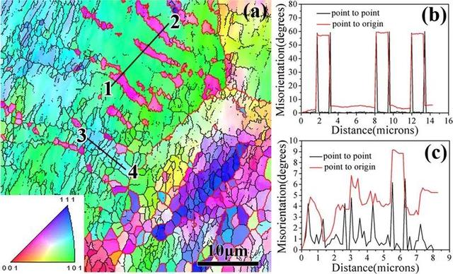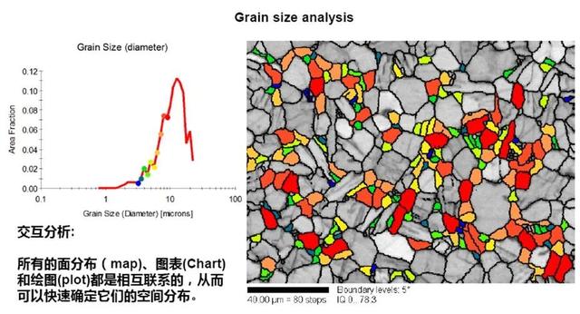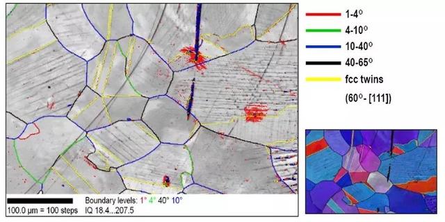 EBSD测量的是样品中每一点的取向,那么不同点或不同区域的取向差异也就可以获得,从而可以研究晶界或相界等界面。