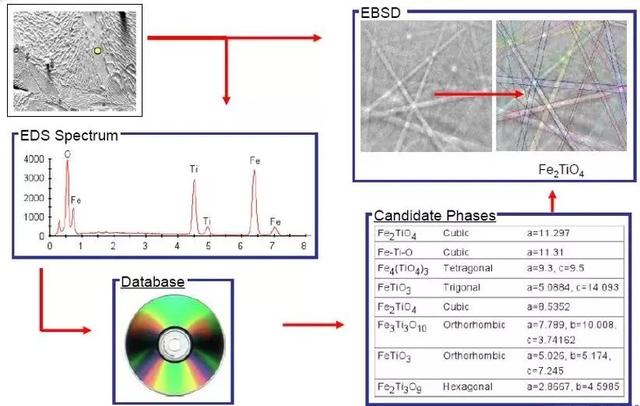 现代EBSD系统和能谱EDX探头可同时安装在SEM上,这样,在快速得到样品取向信息的同时,可以进行成分分析。