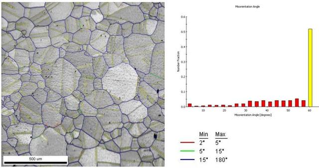 传统的晶粒尺寸测量依赖于显微组织图象中晶界的观察。自从EBSD出现以来,并非所有晶界都能被常规浸蚀方法显现这一事实已变得很清楚,特别是那些被称为“特殊”的晶界,如孪晶和小角晶界。因为其复杂性,严重孪晶显微组织的晶粒尺寸测量就变得十分困难。