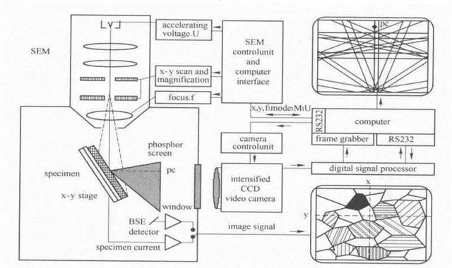 系统设备的基本要求是一台扫描电子显微镜和一套EBSD系统。EBSD采集的硬件部分通常包括一台灵敏的CCD摄像仪和一套用来花样平均化和扣除背底的图象处理系统。图1是EBSD系统的构成及工作原理。
