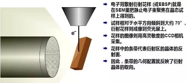 在扫描电子显微镜中得到一张电子背散射衍射花样的基本操作是简单的。相对于入射电子束,样品被高角度倾斜,以便背散射(即衍射)的信号EBSP被充分强化到能被荧光屏接收(在显微镜样品室内),荧光屏与一个CCD相机相连,EBSP能直接或经放大储存图象后在荧光屏上观察到。只需很少的输入操作,软件程序可对花样进行标定以获得晶体学信息。目前最快的EBSD系统每一秒钟可进行近100个点的测量。