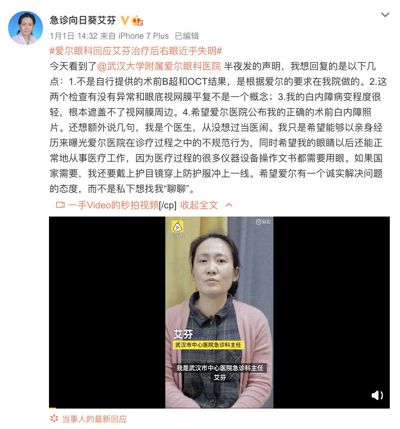 武汉抗疫医生控诉治眼后近乎失明 “我是个医生,从没想过当医闹。我只是希望能够以亲身经历来曝光爱尔医院在诊疗过程之中的不规范行为……”新年第一天,46岁的武汉市中心医院急诊科主任艾芬通过其微博账号@急诊向日葵艾芬 这样写道。 据艾芬自述,2020年5月份,她感到自己的视力明显下降,起初以为是戴面屏护目镜引起的。当时,由于她所供职医院的诊疗业务还未完全恢复正常,经一个关系比较好的三甲医院退休眼科医生建议,她选择到这位医生目前任职的武汉爱尔眼科医院就诊。 检查之后,院方称她右眼患上了白内障,建议她换多焦晶体,并推荐 副院长王勇 实施手术。 5月下旬,艾芬接受手术,摘除了右眼晶体,植入了爱尔眼科医院提供的右眼人工晶体,手术大约花费2.9万元。 由于术后未见视力好转,2020年6月初,艾芬前往爱尔眼科医院复诊,主刀医生王勇告诉她说,这属于正常现象,过一段时间就会恢复。10月,她在自己就职的武汉市中心医院眼科检查, 结果显示其右眼孔源性视网膜脱离,呈灰白色隆起,屈光不正(右眼高度近视),近乎失明。 这说明右眼眼底严重变性。 在凭诊疗单咨询多名眼科医生后,她认识到,按照常规流程,做晶体置换手术之前就该检查眼底,如果早发现、早用激光治疗,情况可能不至于如此。 艾芬也认为爱尔眼科是“为了赚钱”,不必要地摘除了自己原本几近正常的晶体。 不久前,艾芬向王勇索要手术前的晶体照片,对方发来一张白内障病变很严重的照片,这让艾芬感觉“明显是弄虚作假”。她在个人微博写道:“我6月初复诊时在他的电脑上亲眼看过,白内障程度非常轻……我作为一名医务工作者,他们都可以这样做,如果是老百姓就更可能被骗。如果我不出来说话,更没有人出来说话了。”这是她决定曝光此事的原因。 艾芬说,右眼近乎失明之后,她目前只能停诊在家;最让她难受的是,因为这个疾病不能用力,作为母亲不能再抱刚满2岁的孩子,让她觉得“生活瓦解了”。 爱尔眼科称已成立调查组全面调查 事件发酵后,2020年12月31日晚21时20分,武汉爱尔眼科医院通过官方微博发布声明称,对艾芬反映的情况高度重视,第一时间对这一事件的诊疗全流程开展了自查。 经核实,艾芬右眼为高度近视并发性白内障,有手术适应症,术前检查、手术和术后复查等各环节均符合医疗规范。 院方指出,艾芬自主提供的三甲医院术前B超和OCT检查结果,均显示眼底视网膜平复;爱尔眼科医院于2020年5月24日术前眼底检查结果也显示其眼底视网膜平复,未发现视网膜脱离,周边部分被白内障遮挡,与术前艾芬提供的其他眼底影像学检查相符合,有白内障手术指征。术后复诊结果显示,艾芬视力较术前明显提升,眼底视网膜平复。 同时, 医院否认了艾芬所述的“明显是弄虚作假”的情况。 上述声明称:“经核查,我院不存在对患者病历和检查资料进行篡改和调换的情况,我们愿意随时接受社会各界和卫生行政部门对我院的医疗流程和各项诊疗环节进行核查监督。”院方邀请艾芬回来复查,“本着对患者负责任的态度,我们愿意继续为患者提供各方面的帮助,协助其开展后续治疗。” 然而艾芬对此声明并不认同。2021年1月1日下午,她在个人微博回应:“1.不是自行提供的术前B超和OCT结果,是根据爱尔的要求在我院做的。2.这两个检查有没有异常和眼底视网膜平复不是一个概念;3.我的白内障病变程度很轻,根本遮盖不了视网膜周边。4.希望爱尔医院公布我的正确的术前白内障照片。”艾芬还表示,“希望爱尔有一个诚实解决问题的态度,而不是私下想找我‘聊聊’。”