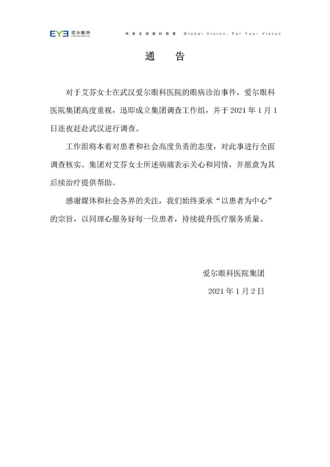 图据@急诊向日葵艾芬微博截图 今天(1月2日)上午,上市公司爱尔眼科医院集团针对此事首度发声。其微信公众号发表声明称, 集团对此事件高度重视,已迅即成立集团调查工作组,于2021年1月1日连夜赶赴武汉进行调查。 “工作组将本着对患者和社会高度负责的态度,对此事进行全面调查核实。集团对艾芬女士所述病痛表示关心和同情,并愿意为其后续治疗提供帮助。”