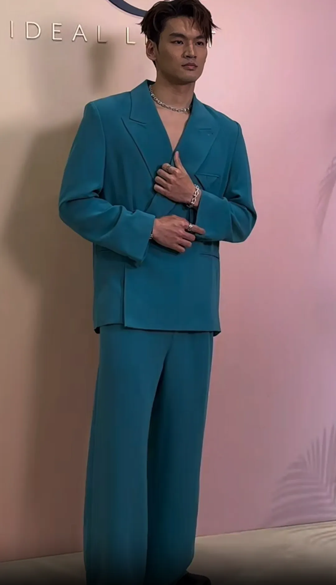 游泳运动员徐嘉余则以一套蓝绿色廓形西装亮相,虽然187cm的高挑身材在西装的分割下显得比例有些失衡,但依然显得人高腿长。